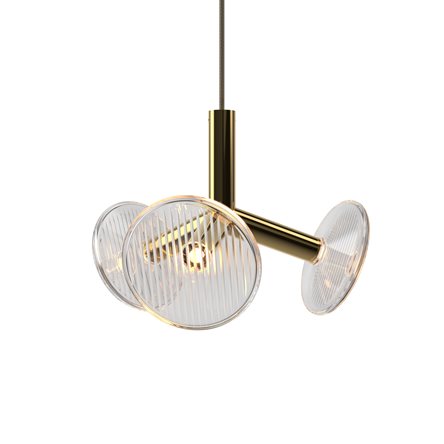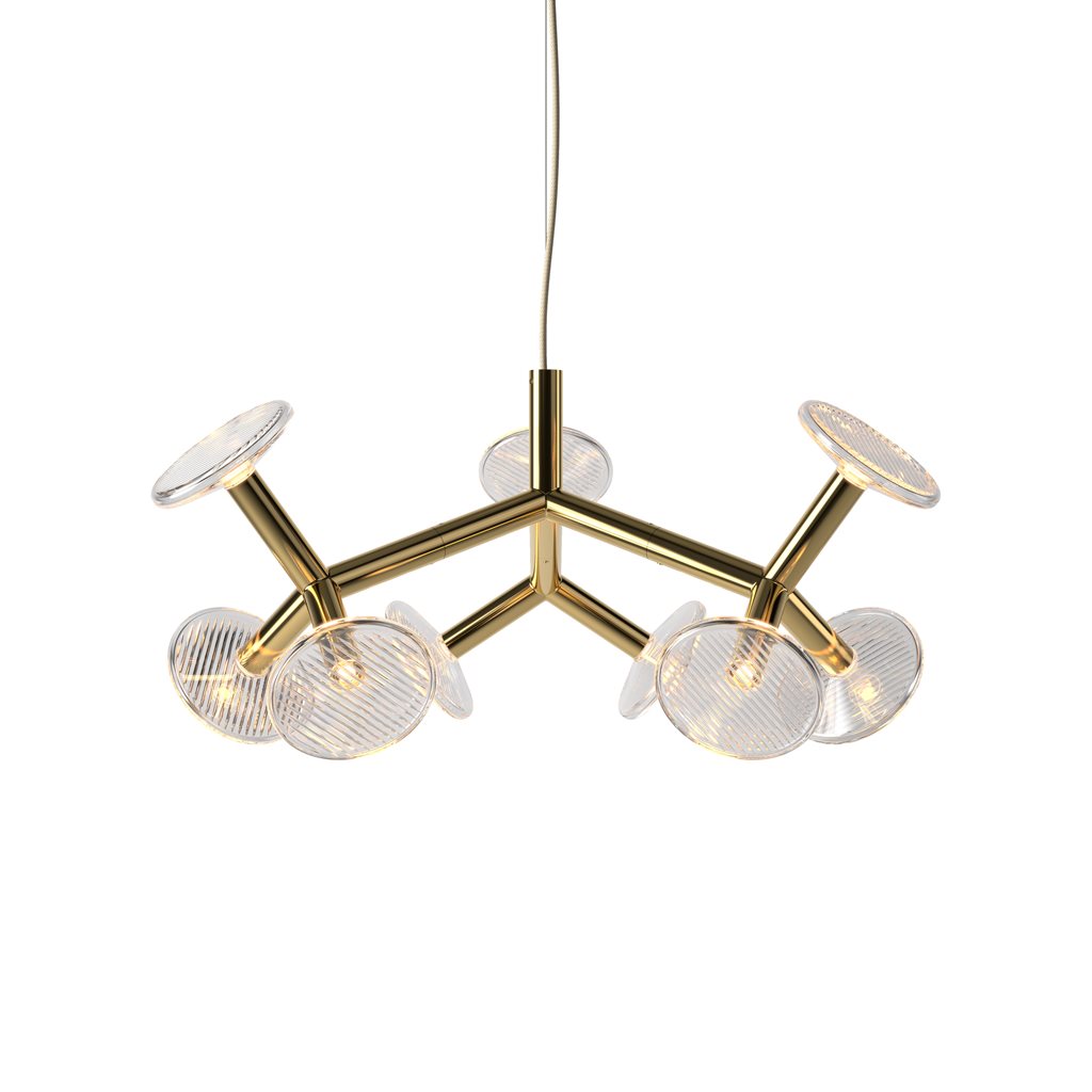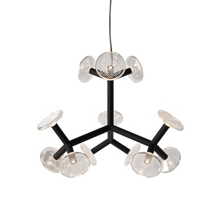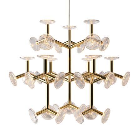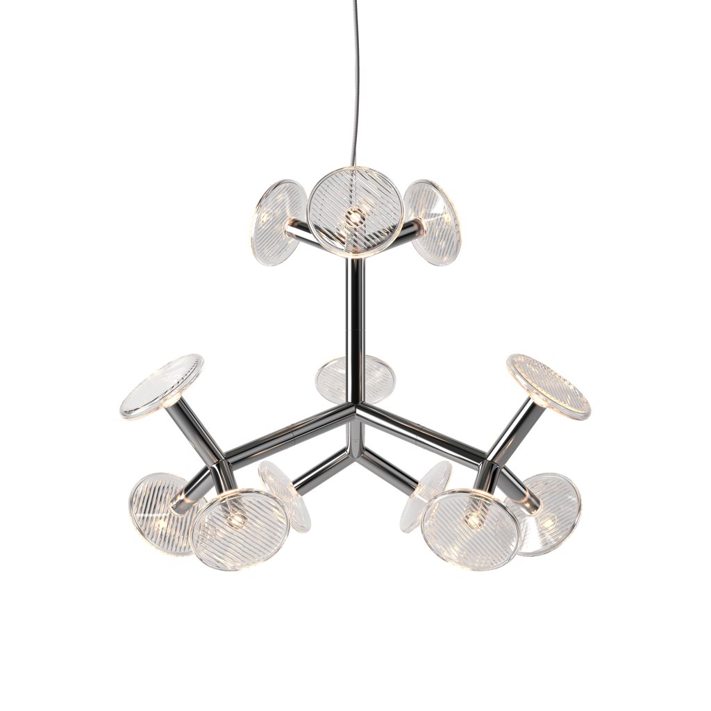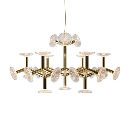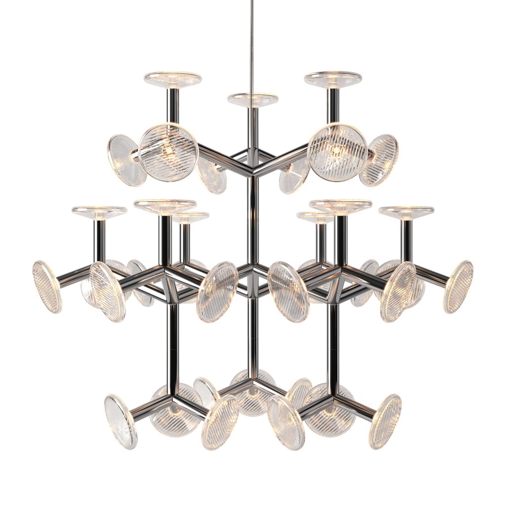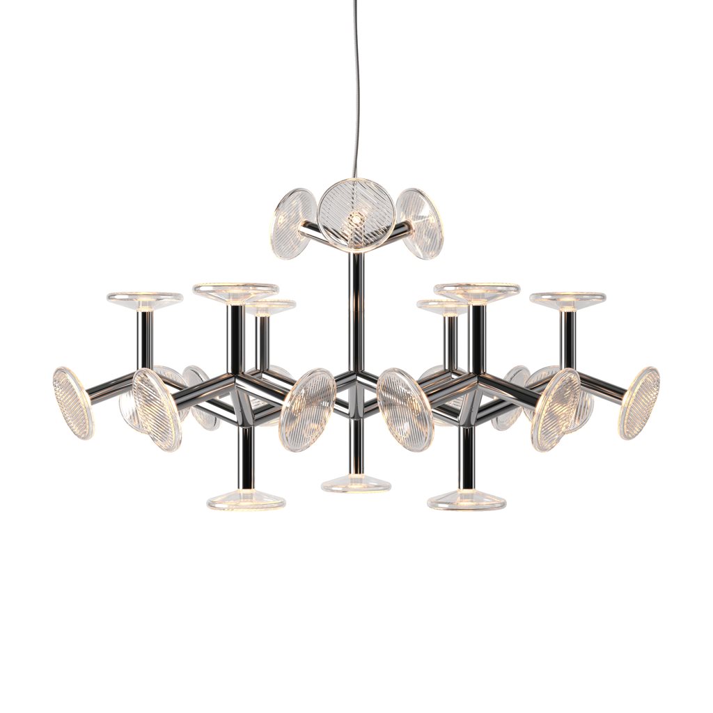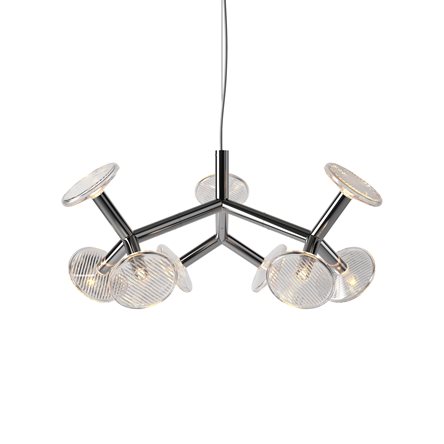 The chandelier’s construction is created through tubular metal ‘branches’ which not only give the fixture its artistic shape, but also conceal the light sources. The branches end with hand-blown crystal plates. The chandelier comes in five different sizes.