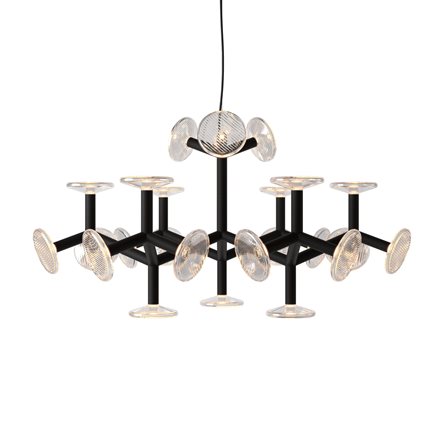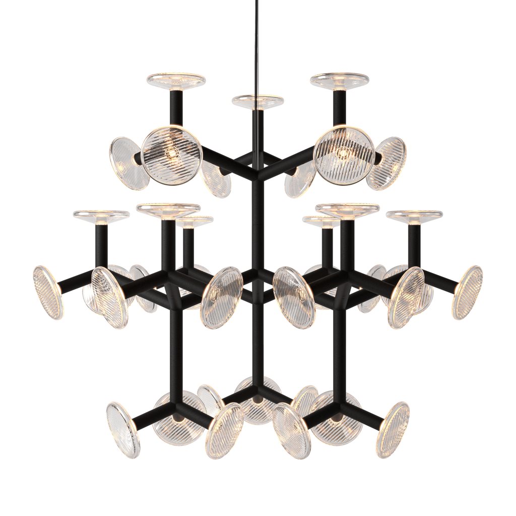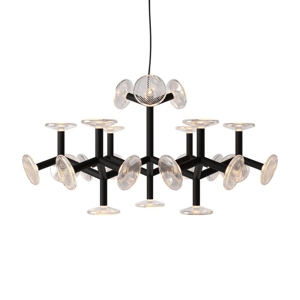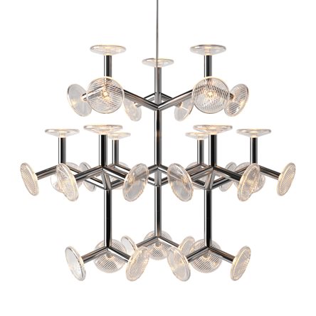 The Fractal family features an industrial aesthetic inspired by nature. A fractal structure is a never-ending pattern. They can be found in nature, for example in the leaves, branches and roots of trees. Our Fractal designed by an internationally established product designer Thomas Feichtner features metal branches and hand cut crystal plates that mirror these natural motifs through a modular structure and reflecting patterns of crystal light.